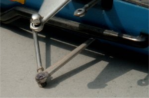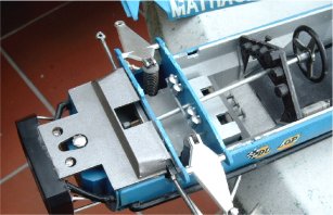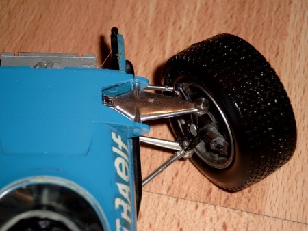 Die Aufhängung hatte es ganz schön erwischt. Sowohl die Befestigung am Ober- als auch am Unterlenker waren gebrochen und danach angeklebt worden. Wie zu sehen hat das Modell jedoch eine funktionstüchtige Lenkung - und die sollte ihrer Bestimmung wieder nachkommen.