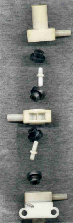 Jetzt sollte man sich einen ruhigen und saubfreien Raum suchen und die 4 Schrauben des Ventils entfernen. Dann läßt sich die ganze Einheit zerlegen. Wen das Bild zu ungenau ist, kann sich eine Zeichnung machen. Die vier Gummidichtungen kann man am besten mit einem Schaschlickstäbchen entfernen. Auf keinen Fall sollte man mit einem scharfen Gegenstand die inneren Dichtflächen malträtieren.