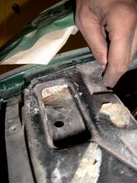 Nachdem man den Rost entfernt hat (nötigenfalls chemisch - Hammerite hat da nen netten Umwandler im Angebot) wird hinter dem Scharnier ein Pfropfen Karosseriedichtmasse angebracht und anschließend das Ganze gründlichst versiegelt. Das sollte für die nächsten 20 Jahre halten *g*