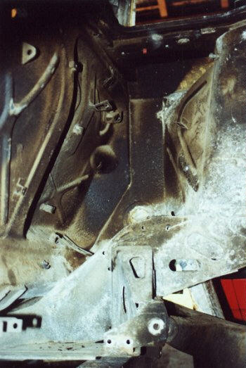 An diesem Wagen lies sich der äußere Bolzen an der rechten Schwinge nicht mehr öffnen, ich arbeite noch an einer "schonenden" Öffnungstechnik, obwohl das Chassis schon beschädigt wurde. Als Hinweis ist der Anblick des Motorraumes zu sehen. Der Unterbodenschutz hinter dem Tank (s. Bild oben) läßt die Vermutung nahelegen, daß die ab Werk aufgespritzt wurde. Die weißen Stellen sind alles potentielle Roststellen, hier ist das Zinkoxid zu sehen. In Zukunft werden hier die Roststellen blühen, wenn sich das Zink dann gänzlich zersetzt hat.