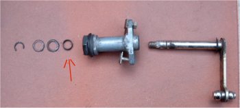 Links ist einmal eine komplette Lagermimik zu sehen. Von links nach rechts sind folgende Teile zu finden: Sicherungsring, Wellenscheibe, Anlaufscheibe, O-Ring (s. Pfeil), Lagergehäuse, Welle.
